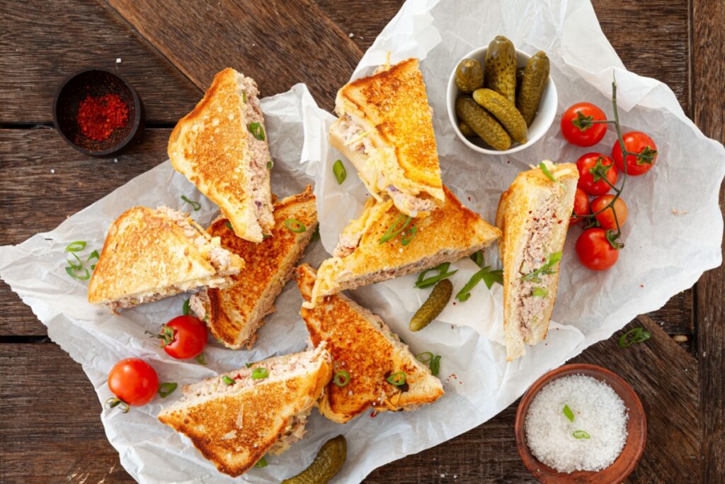 Il Tuna Melt è un grande classico dei diner americani: cremoso dentro e dorato fuori, unisce l’insalata di tonno al formaggio fuso su pane tostato.